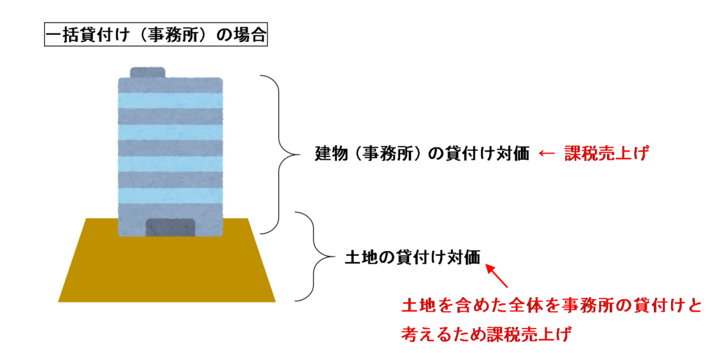 したがって、建物を事務所として貸し付ける場合は、土地を含めた全体を事務所の貸付けとして考えるため、その土地付き建物の貸付け対価の全額が課税売上げとなります。