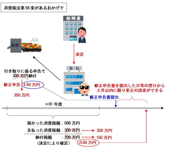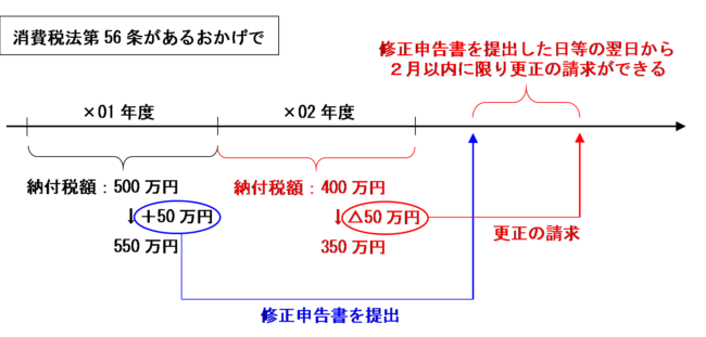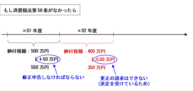 この場合に、もし消費税法第56条の規定がなかったら、×01年度の増加額50万円については修正申告をする必要がありますが、×02年度は決定を受けているため×02年度の減少額50万円については更正の請求をすることができなくなってしまいます。