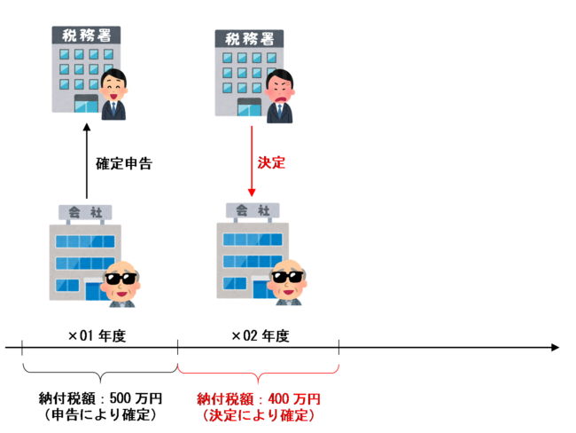例えば、ある事業者が、×01年度は消費税の確定申告書を提出したけど、×02年度は面倒くさがって確定申告書を提出せず税務署から決定を受けたことにより税額が確定したとします。