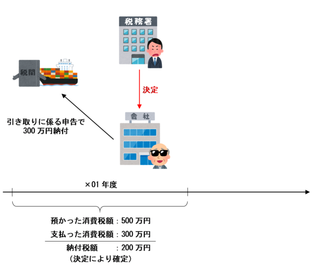 例えば、保税地域から引き取った課税貨物に係る消費税を300万円納付した事業者が、×01年度の消費税の確定申告書は面倒くさがって提出せず、税務署から決定処分を受け納付税額が200万円に確定したとします。