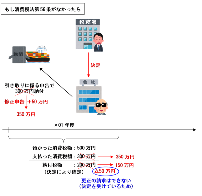 この場合、仕入税額控除される課税貨物に係る消費税額が増加することになり本来納付すべき消費税額は減少しますが、もし消費税法第56条の規定がなかったら、×02年度は決定を受けているため×02年度の減少額50万円については更正の請求をすることができなくなってしまいます。