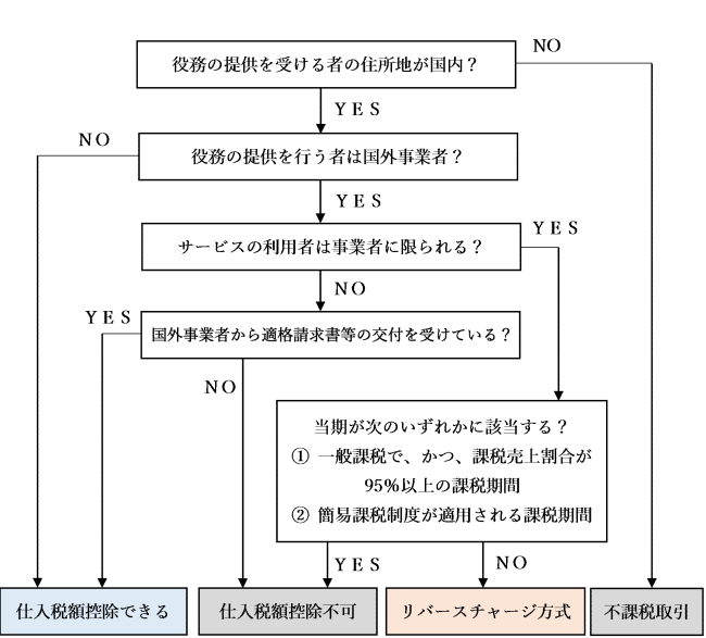電気通信利用役務の提供を受けた場合の消費税の取扱いは、以下のフローチャートに従って判断します。
